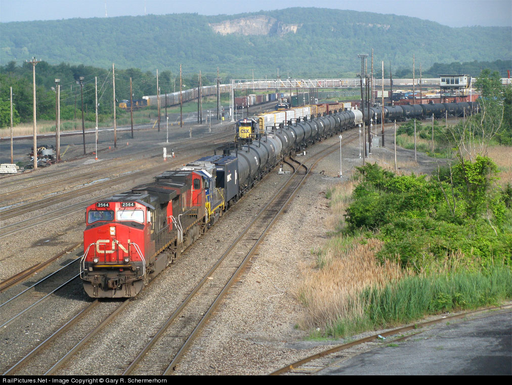 | In this early morning view, we see two eastbound freights departing simultaneously from Selkirk Yard. In the foreground a loaded ethanol train bound for Jersey has a nice CN/CSXT mix of power while two GEVOs haul a loaded autorack off the Inbound Lead in the far background. |