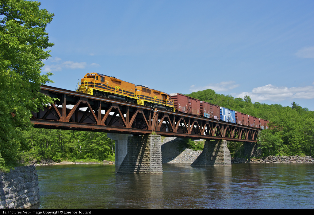 | Tri-weekly Gatineau bound train 739 cross the bridge over la Riviere Rouge (Red River) on the ex Canadian Pacific ''North Shore'' route to Ottawa, ON. Road-Slug QG 801 was ex CSX unit 2123 nee C&O 4823. |