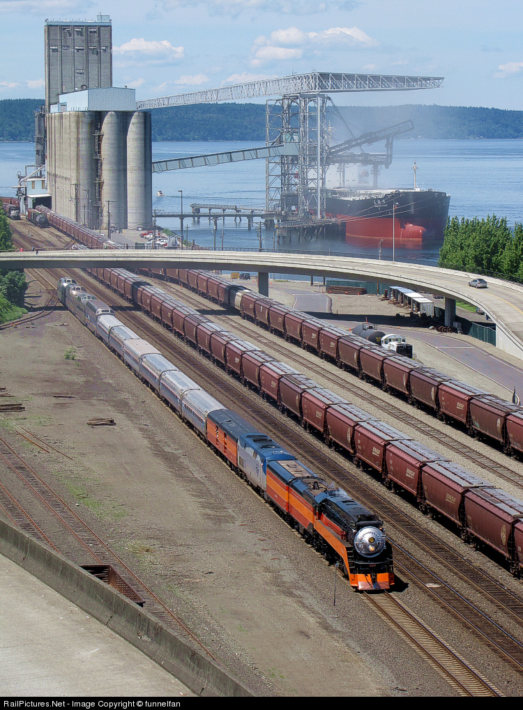 | SP 4449 pulling a NRHS Convention Special arrives in Downtown Tacoma. Passing the Tempco Export Elevator and Half Moon Yard, the train is only a few minutes from it's destination. |