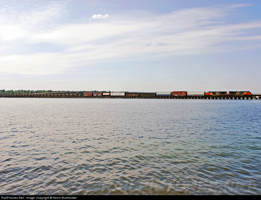CN M324-21 rolls across the lower end (albeit north end) of Lake Champlain on the massive Alburgh Trestle hauling NECR CWR Train #12 behind ES44DCs 2288 and 2251.