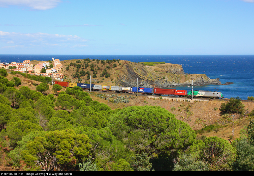An SNCF BB27000 hauling a container train just north of Cerbere, heading for the Spanish border.