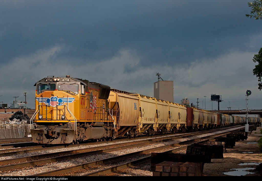Storm light gathers of UP 4774 as it departs CP's Bensenville Yard.