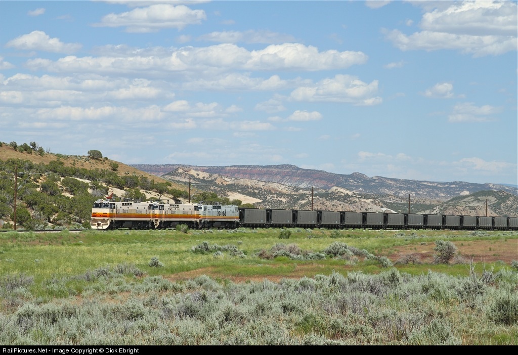 | Deseret Ry's afternoon loaded coal train is slowly grinding up the grade at mp 4.5 toward the railroad's high point, Holum Pass who's summit is only about 1/2 mile ahead.The 3 E60 motors are pulling hard on this 44 car, 7200 ton train. If this was a diesel powered train the passage would be accompanied by lots of loud noise from the engines, but these electrics emit only a steady low humming sound. A very wet and cool spring has western Colorado and eastern Utah looking uncharacteristically green for late June. |