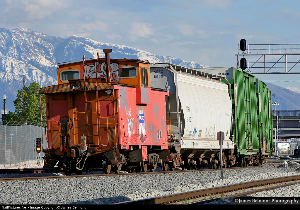 A former D&RGW caboose trails UP's YRO52R switcher approaching the Fourth South yard to tie up for the day.