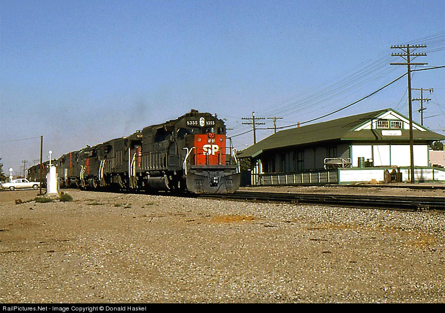 | The halcyon days of the old SP were coming to an end SP power was looking worn and no longer displayed the bright Kodacolor look of Steinheimer's espee. I took advantage of great light to capture a clean SD unit and a nicely restored freight station. |