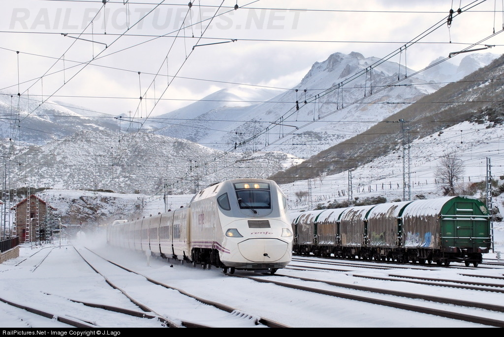 | First "Alvia" service of the day between Madrid and Gijon trought Busdongo town with the lovely landscape of Pajares mountains in the background with a lot of snow looks like a Swedish winter scene. |