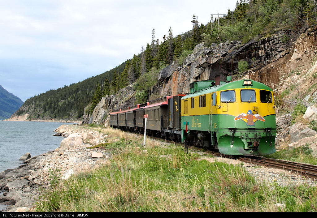 RailPictures.Net Photo: WPY #100 White Pass & Yukon Route GE 90 Class at Between Carcross and Bennett, British Columbia, Canada by Daniel SIMON
