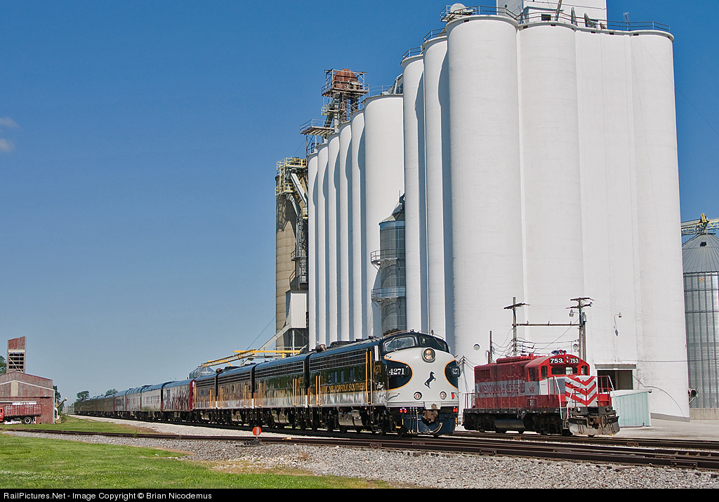 | The NS business train cruises through Hamlet, IN past the Starke County Co-op and the ex-Wisconsin Southern GP7. |