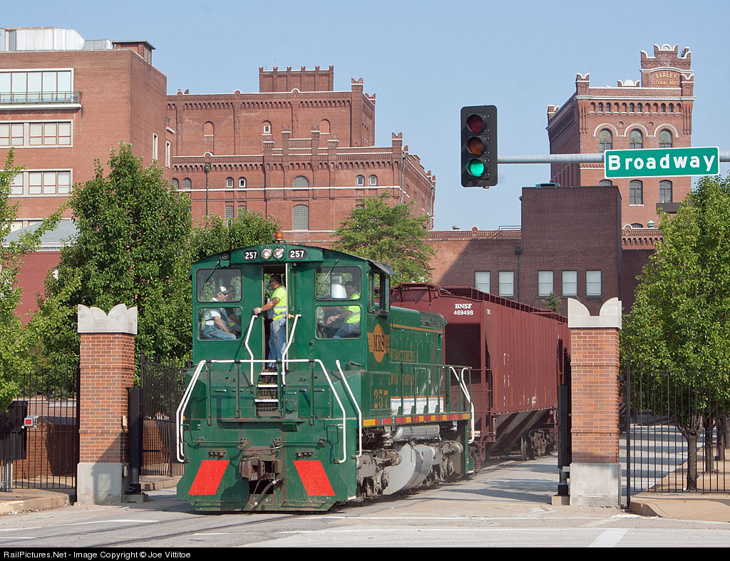 MRS 257 pulls empties through the gates of the Budwieser Plant before returning with loads.