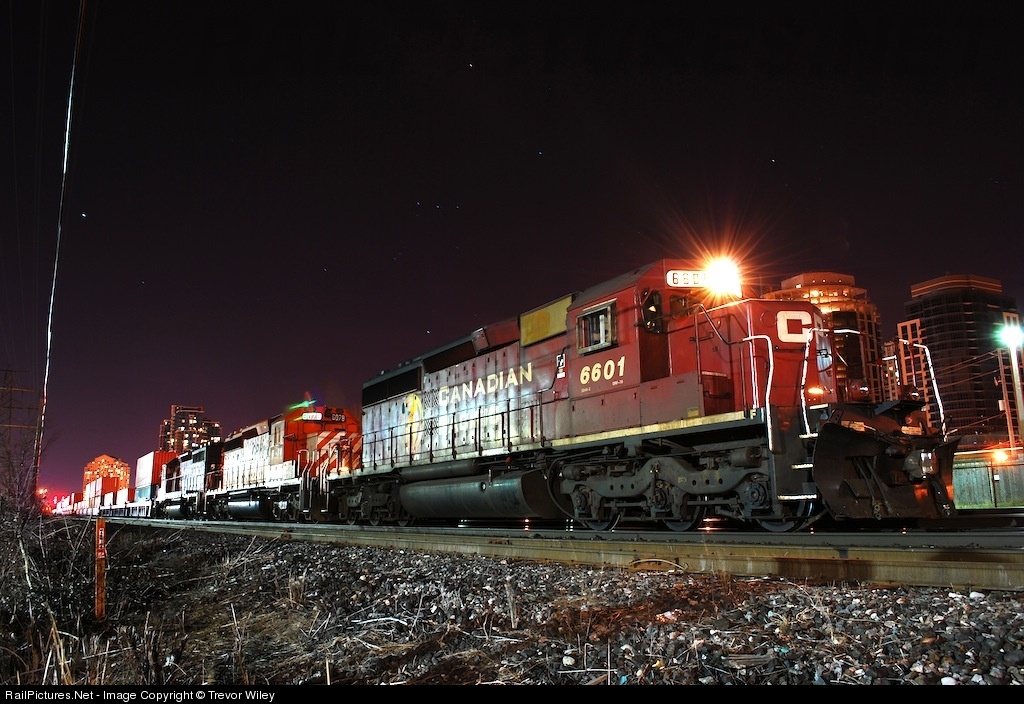 | An Ex Sooline Sd40, 6601 is in charge of tonights 230 as it waits for the crew to return from their Timmies run before doing their paper work and head out for Montreal. |