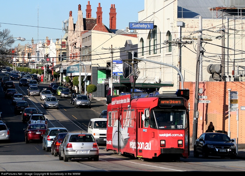 | Running through the High Street, Armadale antique shopping precinct, a tram wearing an all-over ad for webjet.com.au runs on route 6 from Glen Iris to Melbourne University, through Melbourne's inner south-eastern suburbs. |