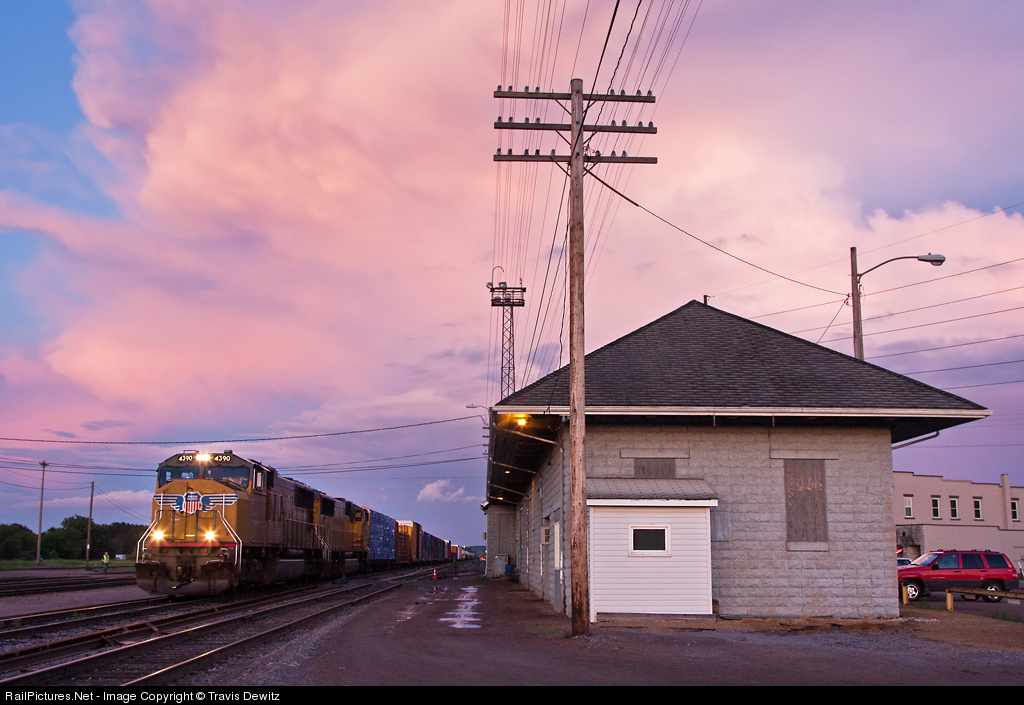 Union Pacific MPRSS has just pulled up to the Altoona depot under an amazing sky.
