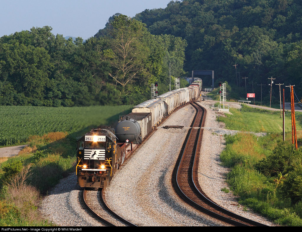 | NS SD70 2533 and former HLCX SD60 6549 just acquired by NS roll train 189 off the single track and over the equilateral turnout at CP-Lunbeck halfway between Portsmouth and Columbus. Sure wish I would have taken this same shot when the CPL's were in place here. |