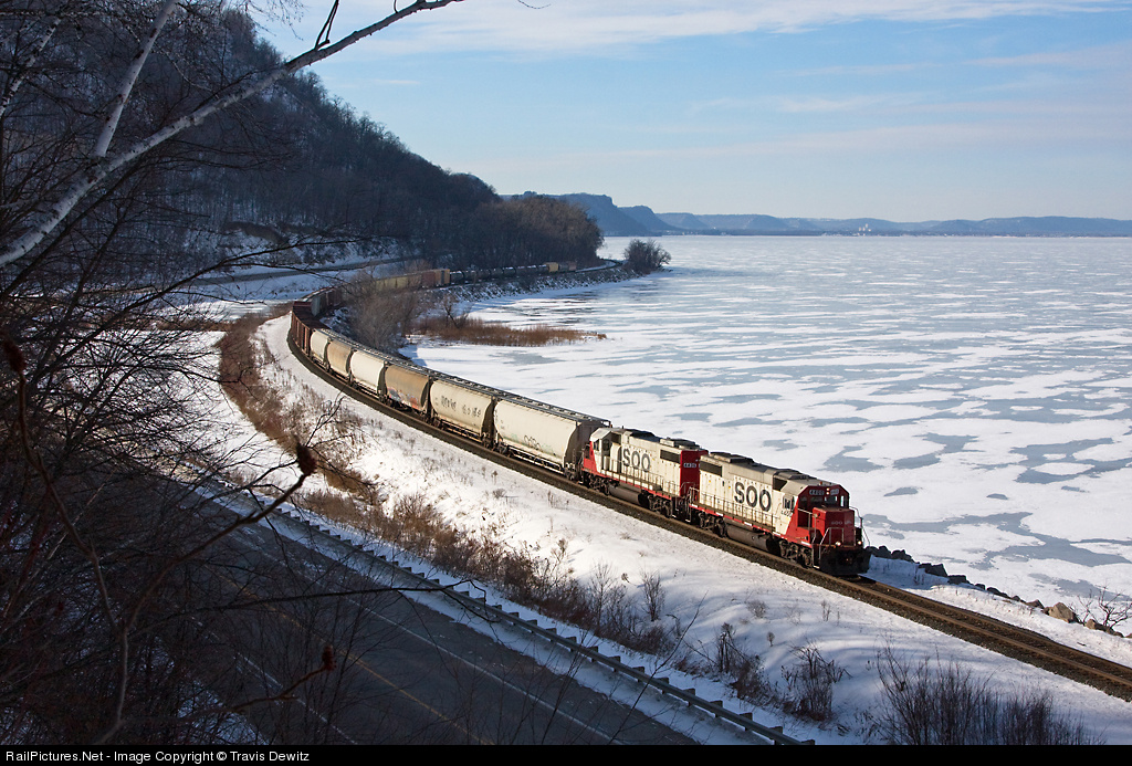 The St. Paul local has a gorgeous matched set of Soo power heading down the frozen Mississippi River at Maple Springs, Minnesota.
