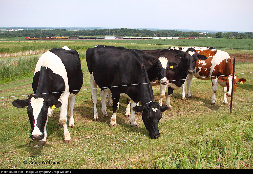 The Green Bay, WI, to Clearing, IL, freight train climbs Bryon Hill south of Fond Du Lac as a few cows go about their morning business. This train will head into the BRC once arriving at Chicago.