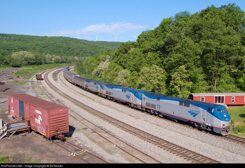 | 73 leads the Capital Limited around the big curve near Sand Patch Summit, eastbound on the west track due to track work. The windmills in the background were all turning, usually two or three aren't. |