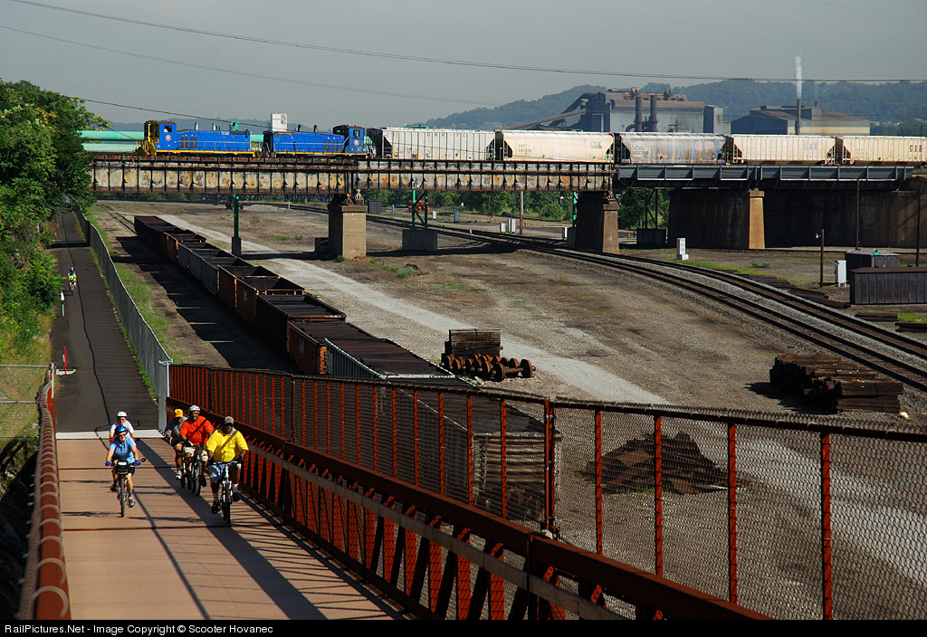 | A hot and hazy morning are no match for bikers or buttheads. A pair of Union MP15's in their classic dress begin the shove across the Mon and into Edgar Thomson as a gaggle of bikers begin the climb up the flyover bridge that takes the Great Allegheny Passage over top of NS's Mon Line. |