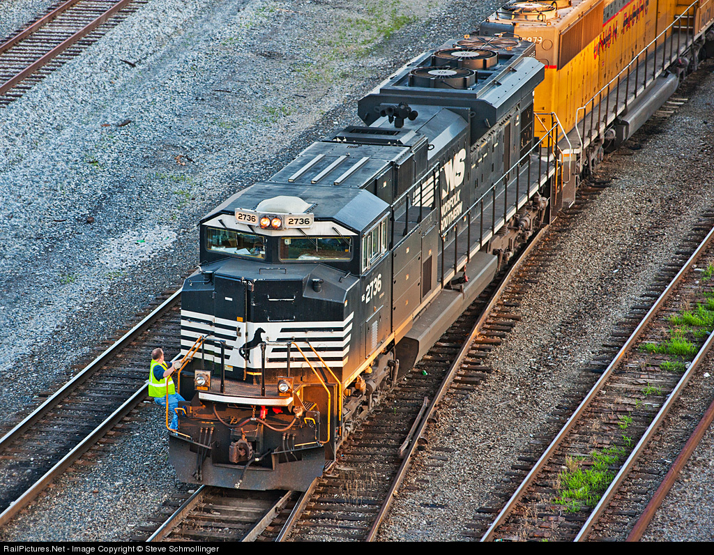 | As the conductor of NS 2736 North climbs back aboard his lead locomotive, he quickly scans his train to ensure all is as it should be. |
