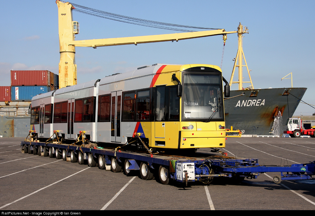 New Flexity tram number 113 on the wharf at Appleton Dock prior to being road hauled to Adelaide.