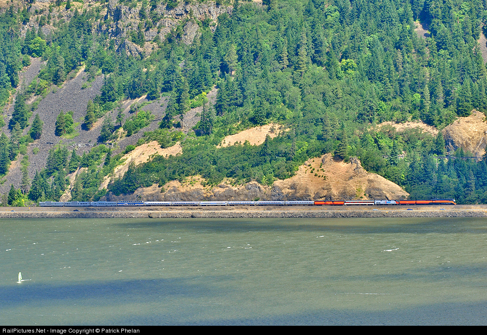 | SP 4449 heads east to Wishram as seen from across the Columbia River near Hood River, OR. The scenery around here certainly makes a big 4-8-4 and passenger train look small. The wind surfer was a nice bonus. |
