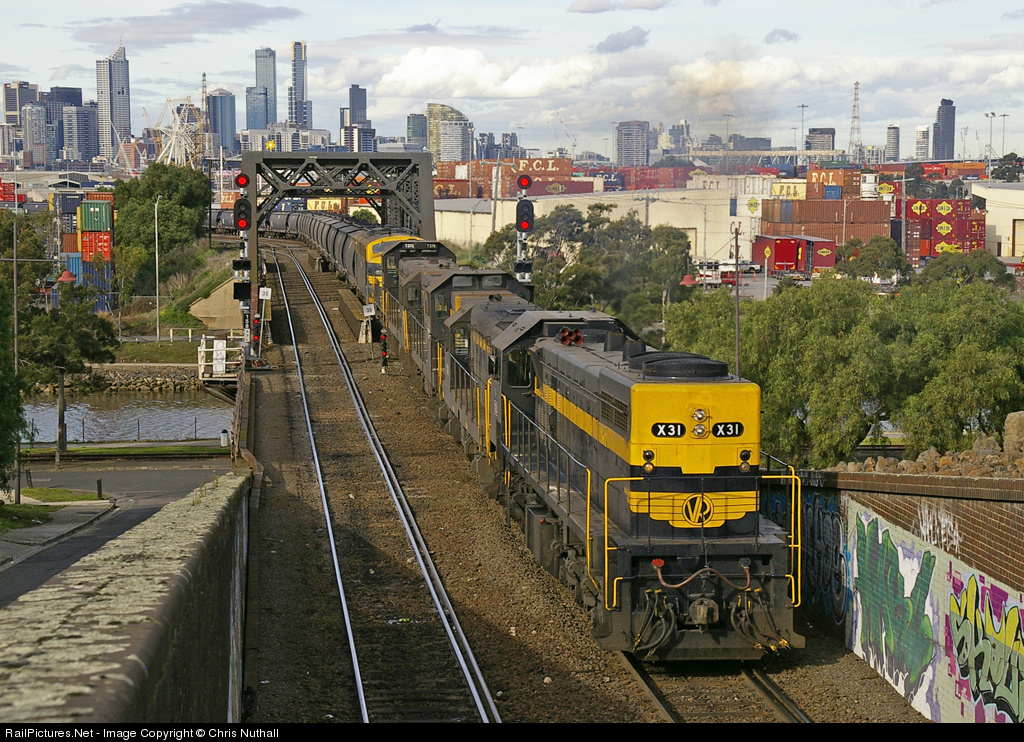 Running as originally designed, although not everyone's favourite as far as photography is concerned, long end leading X31 is about to enter Bunbury Street Tunnel with the all VR lash-up of T341, T357, T320, T378 and B74 on 9161 empty grain from Appleton Dock to Manangatang in Northern Victoria,