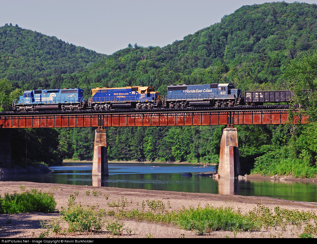 Running short on crew time, the NECR 324-13 looks like a who's line is this anyway photo at Sharon, VT with NECR SD40 6281, NECR GP38 3847, and FEC GP40-3 437 crossing over the former Central Vermont Railway's bridge.
