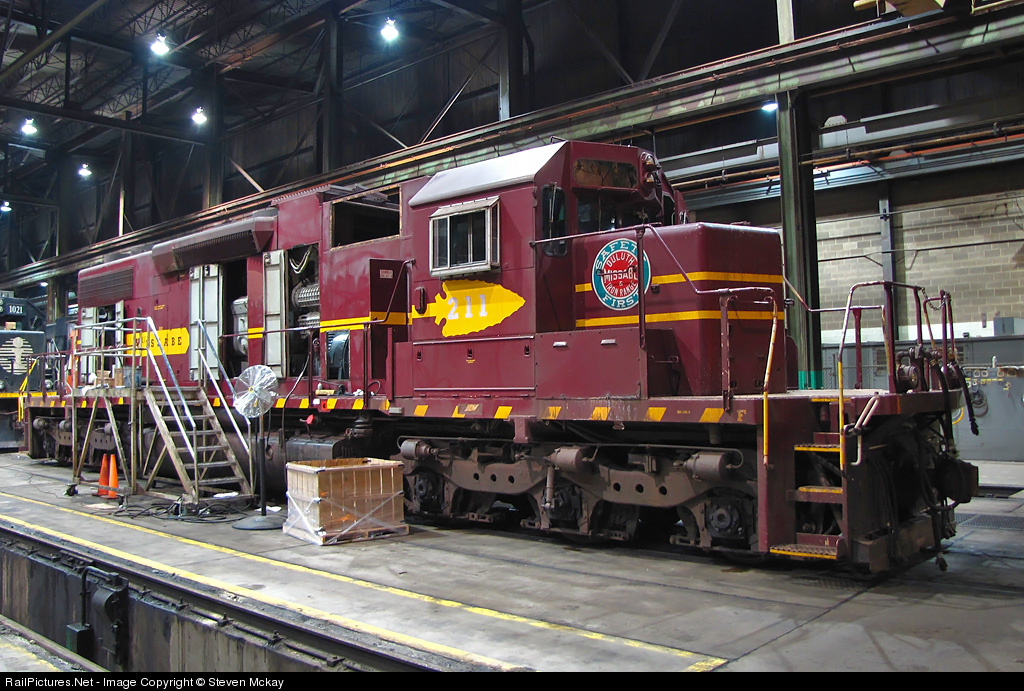 | DM&IR 211 former ISO 9002 sits in the wheel shop/ heavy repair area at CN's Woodcrest shop. After sitting in the deadline for several months 211 was brought out of storage for reactivation, a minor rebuild and also a coat of CN black and red before being sent back to the DM&IR. This is one of the last time's anyone shot the 211 in its maroon and gold paint. |