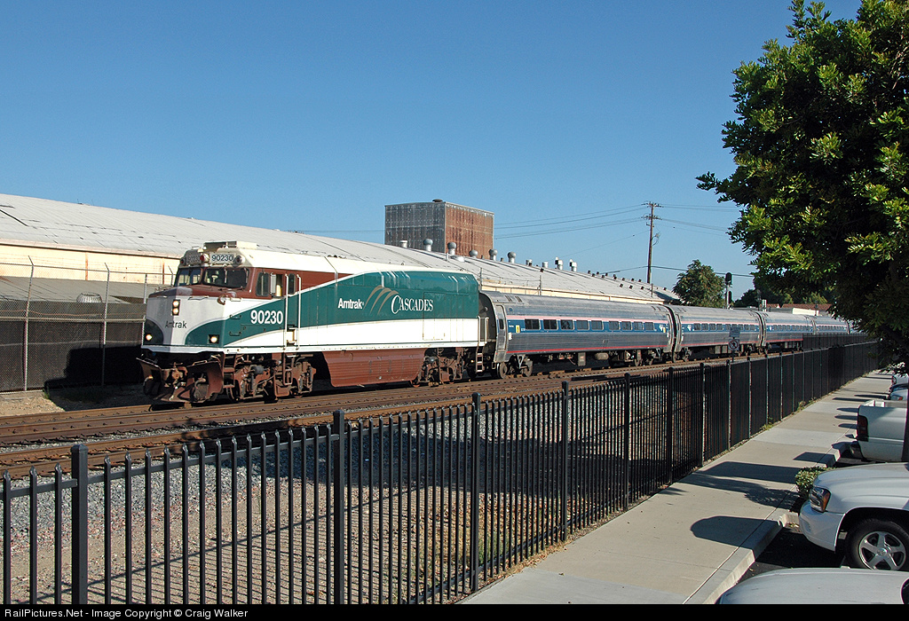 Each July, the horse racing season comes to San Diego County's Del Mar Racetrack. And with it, increased ridership on Amtrak's Surf Line, and to handle the increased crowds one train set of older cars is placed into service between Los Angeles and San Diego (in order to allow one train set of Pacific Surfliner cars to be broken up to lengthen other trains on the line). In 2011, former F40PH-turned-cab car 90230 (originally Amtrak 230), painted in the Pacific Northwest's attractive Cascades scheme, traveled south to lend an assist. Northbound Amtrak Pacific Surfliner #583, running nearly forty minutes late (due, in large part, to longer station stops necessitated by the older cars), zips through the Metrolink station in Orange, California, on July 21, 2011.