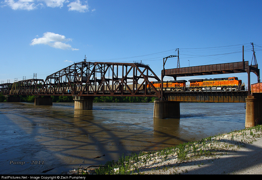 A BNSF empty coal train crosses the Hannibal Bridge into Kansas City from BNSF Murray Yard in North Kansas City, MO. This train was being detoured via the Ex-ATSF to Colorado before returning north to the Wyoming mines. Usually this train would go north out of here via the BNSF St. Joseph Sub., and Ex-BN lines across Nebraska. The St. Joe Sub. is currently flooded out in several spots by the Missouri River.