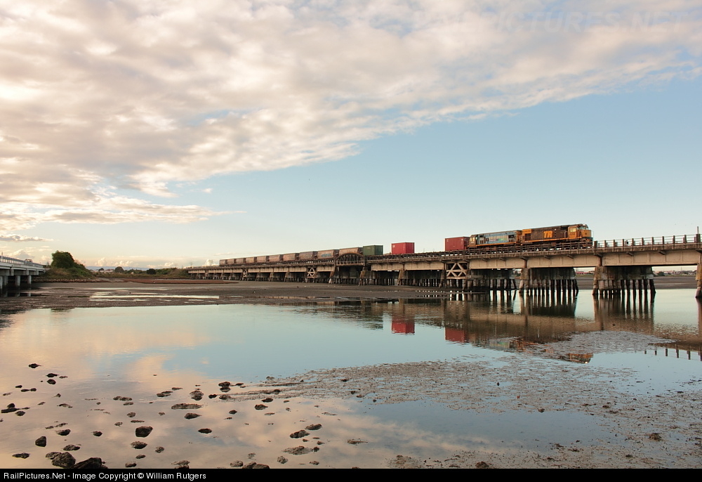 Trains on 3' 6" (1.067m) track from Whangarei to Bluff with virtually heritage rebuilt EMD and GE locomotives still the mainstay power. The network was privatized in 1990's and operated by Toll until 2008 when state owned KiwiRail was established.