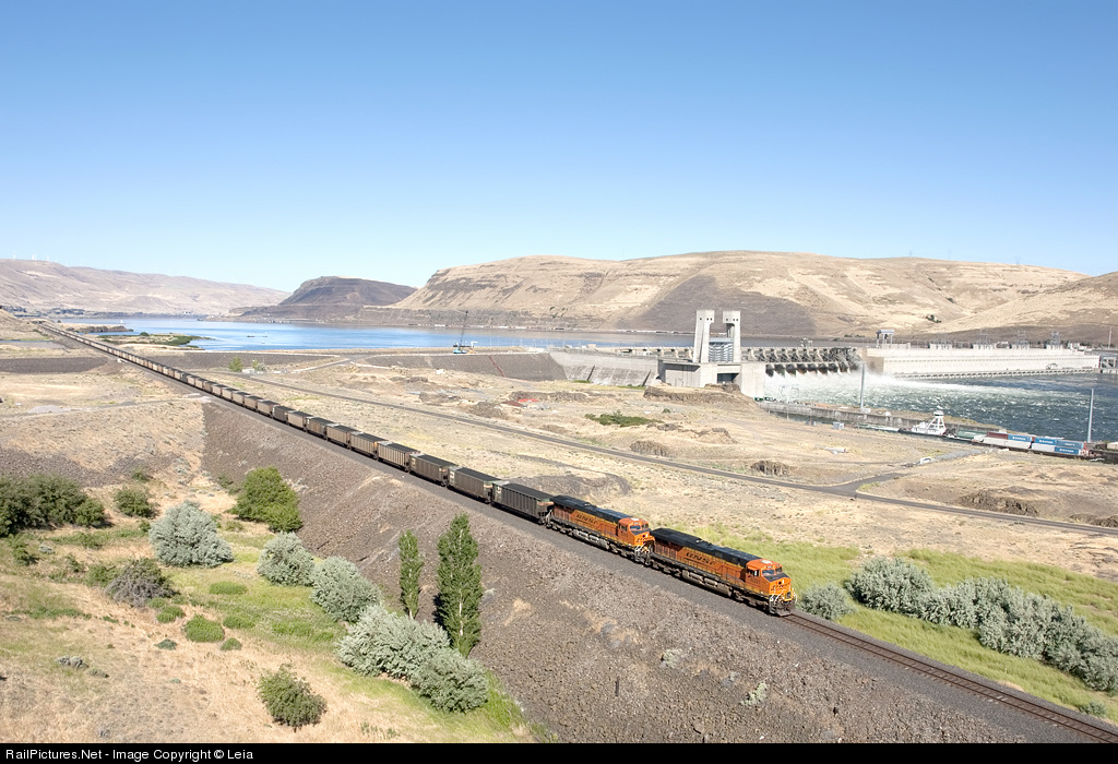 BNSF 6331 leading a westbound coal train passing the John Day Dam on the Columbia River, shortly before it experienced mechanical failure and had to stop at Horse Thief Lake just west of here.
