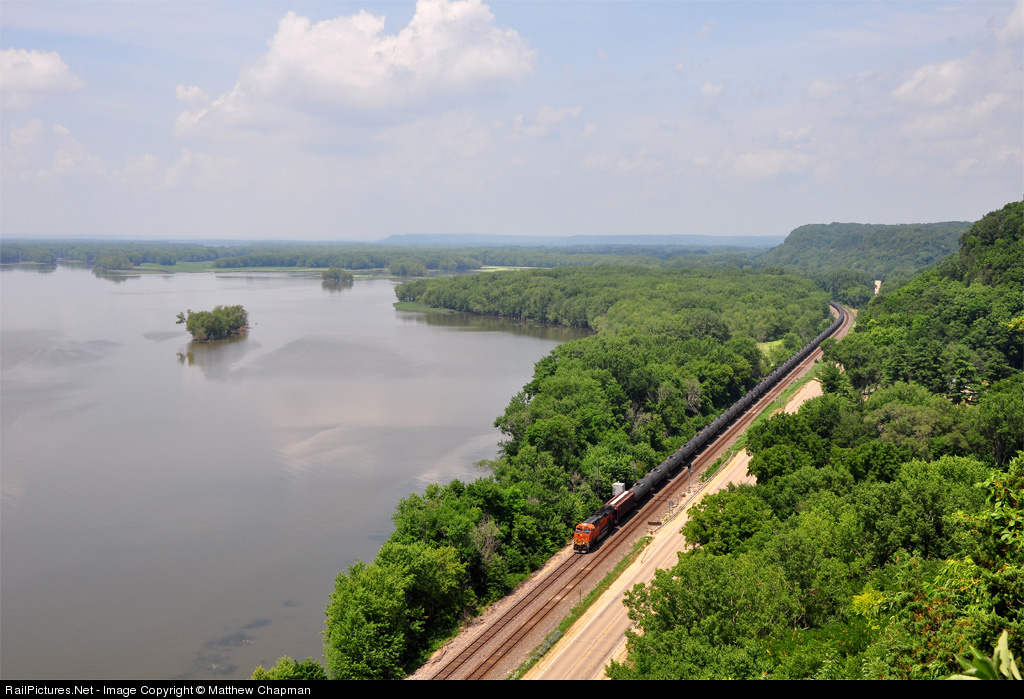 A lone GEVO brings what looks to be an ethanol train down the BNSF Aurora Sub next to the serene Mississippi River on a brutally hot day.