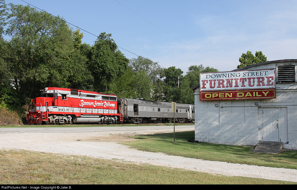 Branson Scenic Railway's red and silver GP30 guides tourists out of the entertainment hub of Branson and deep into the Ozarks. Branson's next door neighbor city, Hollister, has unique storefronts and a railroad depot, although the Branson Scenic doesn't stop here. On the other end is F9PH, which leads the train north back to Branson.