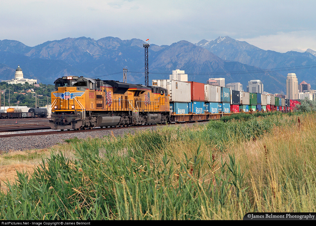 | An EMD/GE combo leads Union Pacific's Long Beach, CA to Global 2, IL stack train east through UP North Yard in Salt Lake City. |
