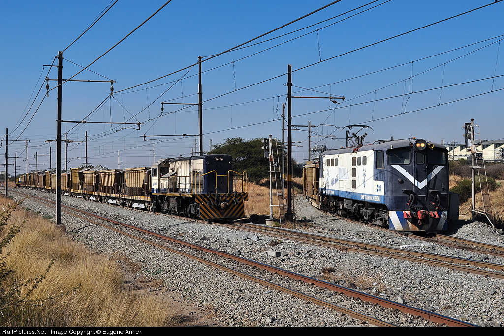 Day and night, trains come and go at Impala Platinum's main processing plant, visible in the right background. On the left, GE UM10B No.20 waits for ex-SAR class 5E No.24 to move off with a load of empties, before it can back its train of loaded hoppers into one of the unloading bins. No.24 is the last operational class 5E locomotive in South Africa, one of 160 that were built for the South African Railways (SAR) from 1955 to 1959.