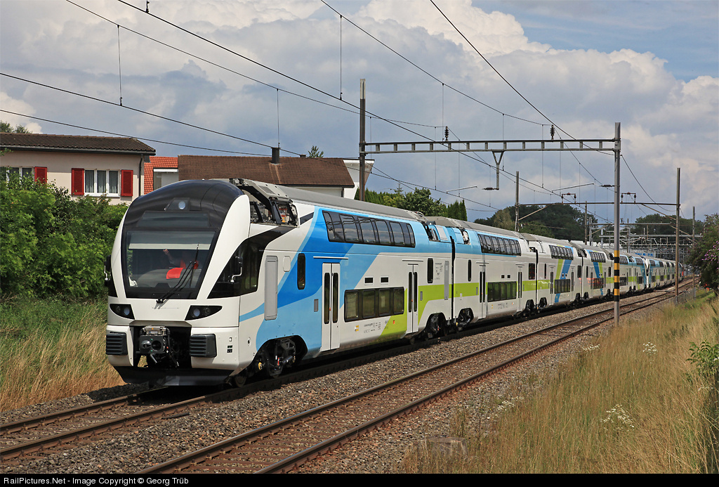 | Two brandnew coupled 6 car doubledeck trains ET 4010 # 002 and 001 for the austrian "WESTbahn" are leaving StadlerRails train commissioning centre (IBS) in Erlen. This KISS trainsets will start service between Salzburg and Vienna in december 2011 with speeds up to 200 km p.h. |