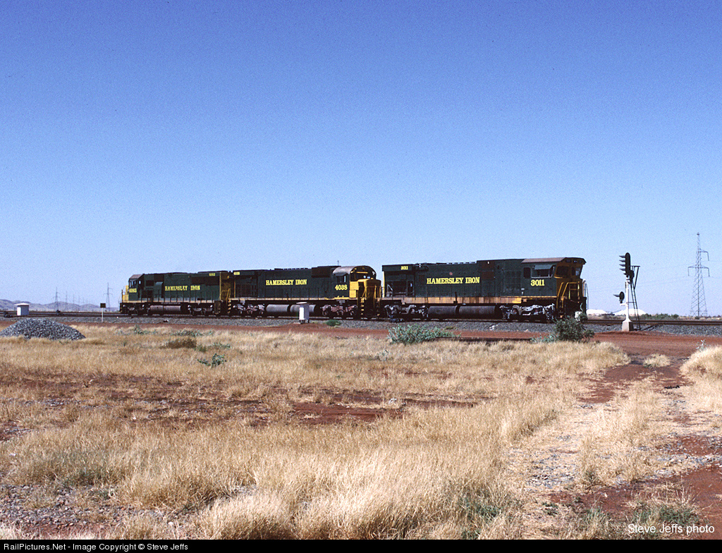 A trio of HI green machines have whistled out of loco and are waiting to proceed towards Dampier. 3011 built 1968 and rebashed in 1984 with the Pilbara cab, 4038 a 1971 M636 and 6063 a 1982 SD50s. 3011 still exists today now owned by Coote Industrial.