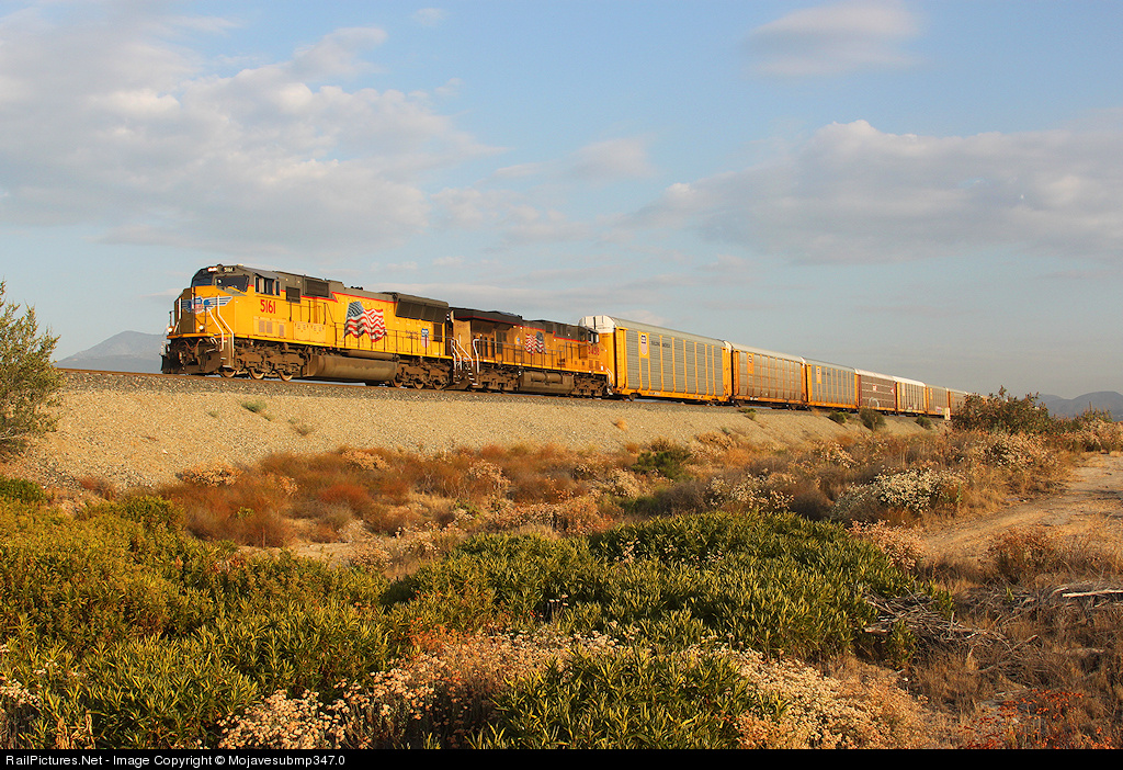 | Early morning just south of the siding at Dike, on UP's Palmdale Cutoff finds the Southbound auto train decending the grade towards West Colton. |