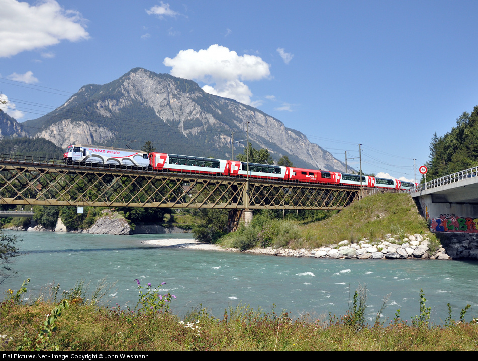 Ge4/4 650 with it's special outfit for the world culture heritage of the narrow gauge railroad line over the Albula route leads a Glacier Express over Rhine river at Reichenau. From here, the train will soon climb upthe Albula valley through the famous world culture heritage.