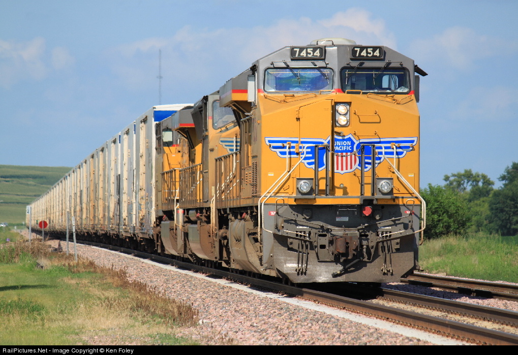 | Union Pacific 7454 sits quietly on a hot & humid afternoon in the aftermath of a 22-car coal train derailment about 10 miles ahead in Denison, Iowa. |