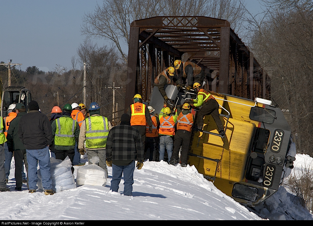 DITCHED, part 4: READY TO LIFT. On Wednesday, February 9, 2011, a southbound New England Southern light engine struck a patch of ice and toppled a full 130 degrees off the tracks and down an embankment. The FRA blamed illegal snowmobile activity as the cause of the ice pack. In this scene, crews from Winter's Rigging have dragged the engine up from the ditch. They've already positioned it close to the rails. Now, they're attaching cables to the conductor's side of the unit to help them swing it upright. Digital photo. Taken from a controlled scene with the explicit permission of local law enforcement and first responders. Click here to view my next photo of the cleanup, showing crews actually picking up the locomotive.