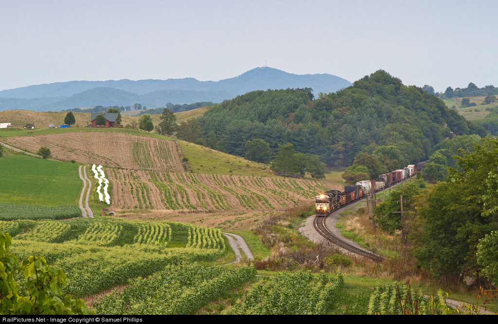 | On a humid Summer afternoon, NS 15T charges uphill into Wytheville VA and past a beautiful farm scene with three big GE's in charge of today's train. The train has a straight shot into Bristol after meeting 38Q and 23G a couple miles behind at Gunton Park. |