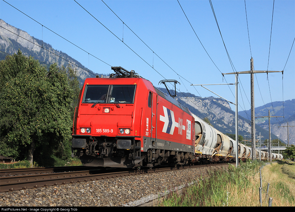 | 185 589 of Hafen und Güterverkehr Köln (HGK) with the empty coal dust (powdered coal) train from Zizers cement factory back to Frechen near Cologne/Germany rolling through Maienfeld between Landquart and Sargans. The loaded train arrived in Switzerland early in the morning the same day. The train is in charge of BLS Cargo Railway in Switzerland. |
