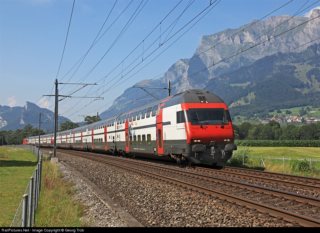 | Doubledeck InterCity train 575 from Zürich is reaching Landquart, the first stop in canton Grison, in a few seconds. The pictures on the side of the cab car are pointing to the family area on the upper deck. In the background Fläscherberg (Regitzerspitz) on the left and Falknis (2560 metre) on the right. |