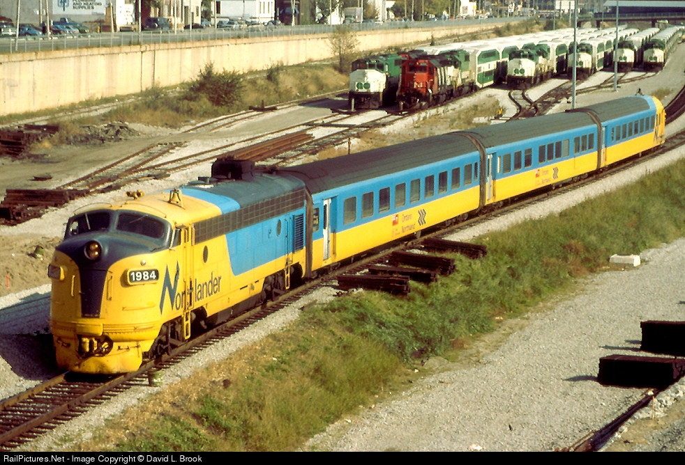 | 1984 heads west then north for North Bay. The cars are a former Swiss Trans Europe Express 3 car set. The original power unit was changed when it couldn't cope with Canadian winters. |