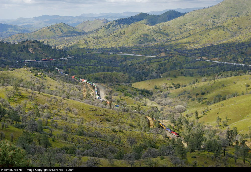 The Katy heritage unit on the point of a 7 units lashup near the south end of Marcel siding in Tehachapi Pass.