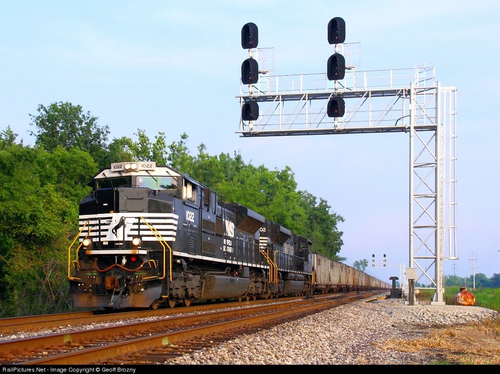 A new SD70ACe, NS 1022 and a SD70ACe that has been around for a while, NS 1002 provide the power for this coal drag, heading west under the Lockbourne signals.