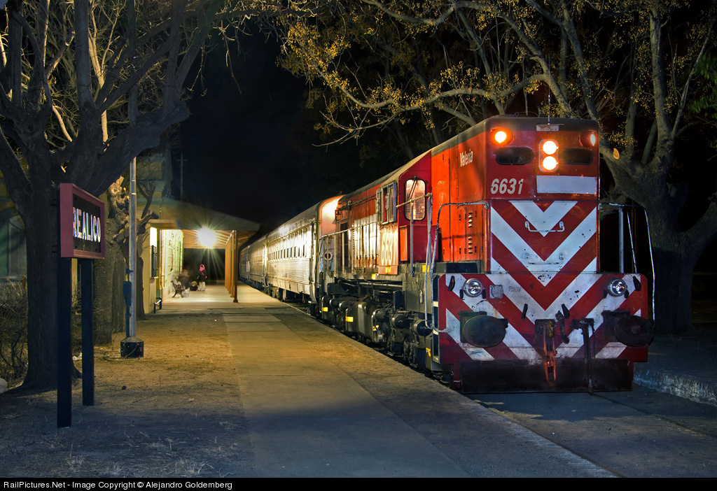 Intercity Train operated by SOFSE ( Sociedad Operadora Ferroviaria del Estado) w/ locs provided by Ferroexpreso Pampeano., normally an EMD GR12 or mexican G12. Note the piece of paper hiding the name of the company, located by the number 6631