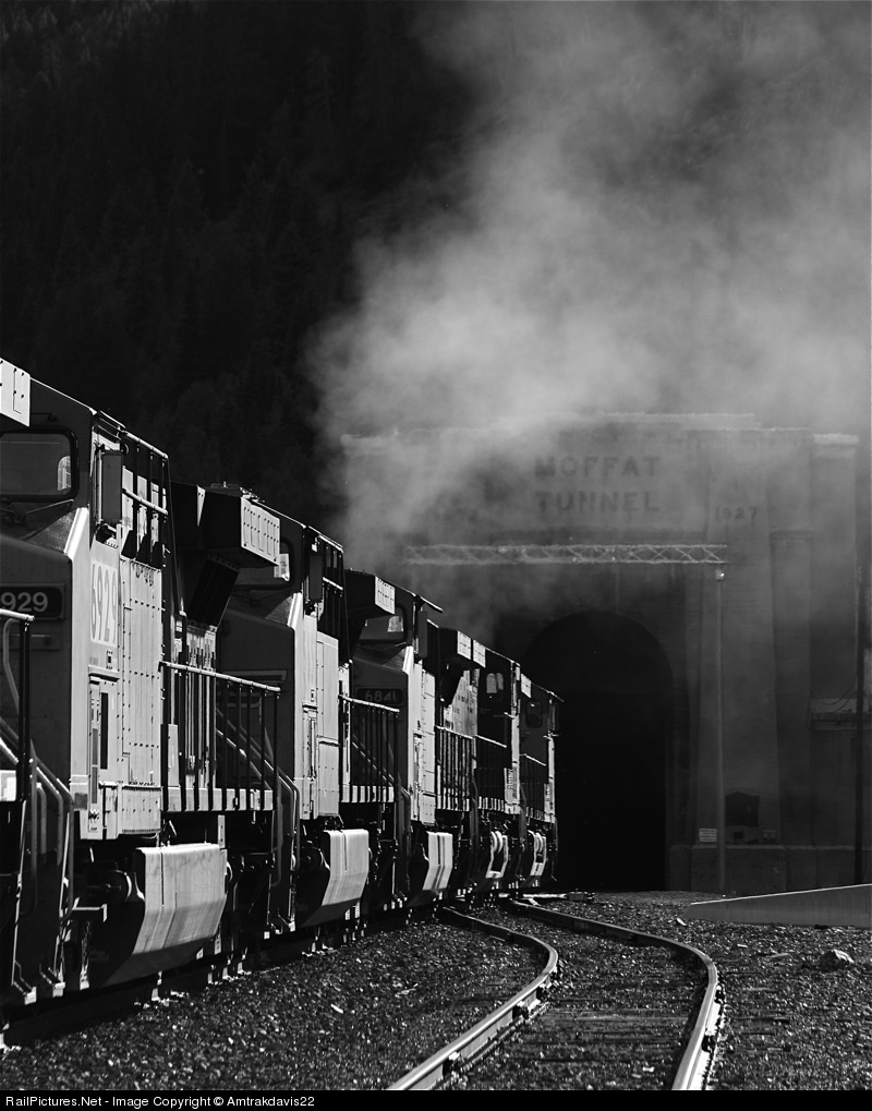 | Union Pacific 6929 is seen here as part of a long power set leading a coal train into the Moffat Tunnel. Because of the exhaust these units put out, the Moffat Tunnel needs about twenty or thirty minutes of venting between each train. Some of these trains are working so hard, they end up reminding me of steam locomotives. UP is our eco friendly railroad. |