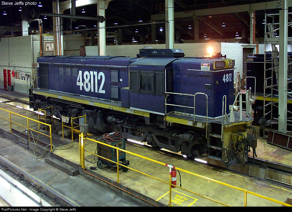 | Dinky toy aussie alco 48112 requires a wheel-set traction motor change and is over the drop pit. A quiet spell inside the shed during back shift permits me to shoot at it. Today 48112 still exists but is stored out of service by Pacific National. |